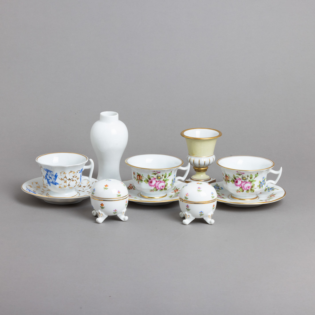 Em porcelana moldada de diferentes épocas, decoração diversa. Composto por uma jarra, urna, um par de caixas redondas e três chávenas de chá com pires. Sinais de uso e esbeiçadela na base da jarra.