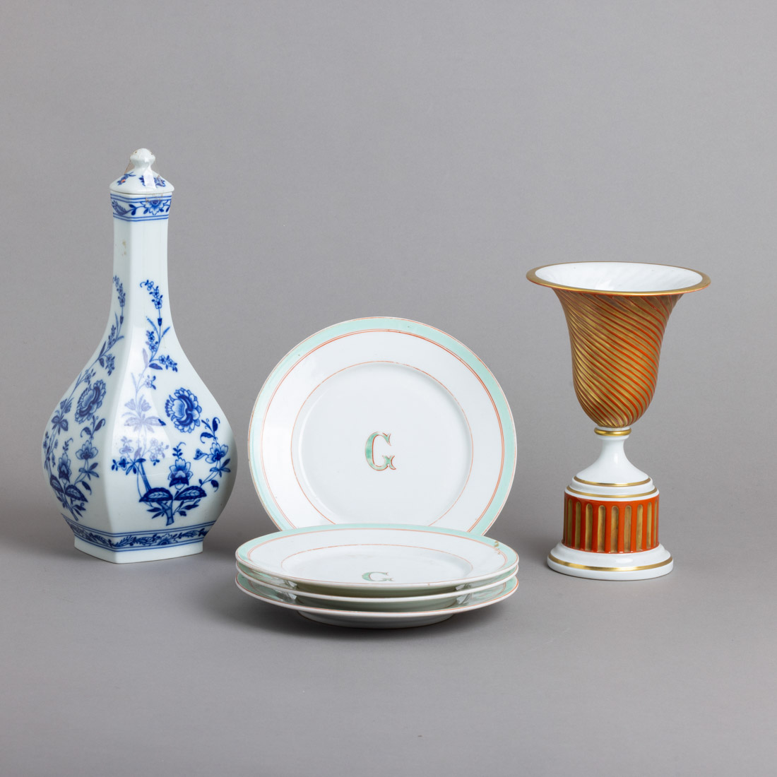 Em porcelana moldada do Séc. XIX/XX, decoração diversa, pratos com letra "G". Sinais de uso, pratos com desgaste e um com cabelos.
