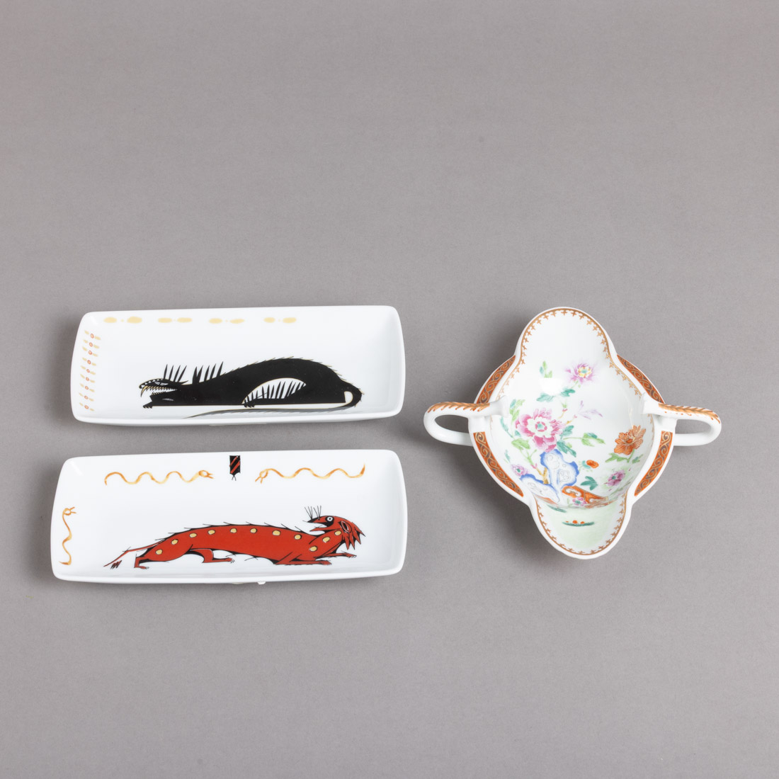 Em porcelana moldada (1992-1997), decoração policromada com dragão e gato "La légende de S. Julien l' Hospitalier" de Gustav Flaubert. Ilustrações de Amadeo Souza-Cardoso, 1912, Centro de Arte Moderna. Edição Fundação Calouste Gulbenkian, e azeitoneira NGao gosto da porcelana da China, decoração policromada da família rosa e dourado, do Instituto Português de Museus. Sinais de uso.