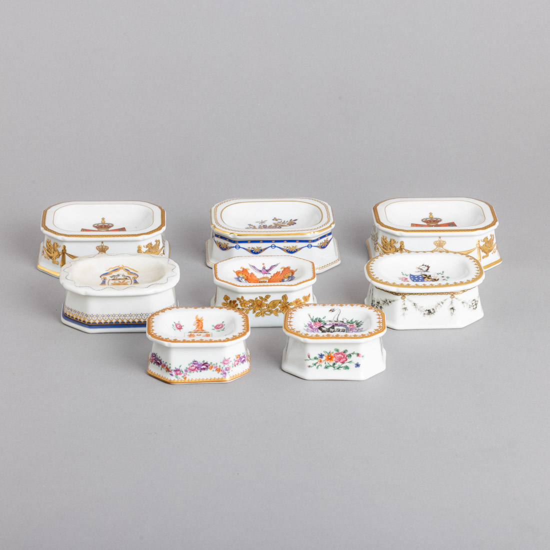 Em porcelana moldada (1980-1992/1997), decoração policromada e dourada diversa, sete armoriados. Sinais de uso.