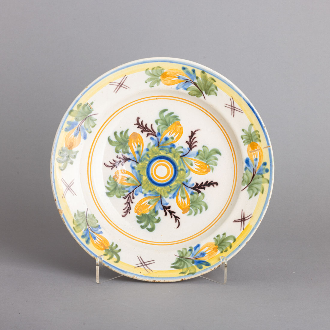 Em faiança portuguesa, decoração policromada "flores e elementos vegetalistas". Séc. XIX. Sinais de uso, leve desgaste no vidrado, esbeiçadela e pequenos cabelos na base.