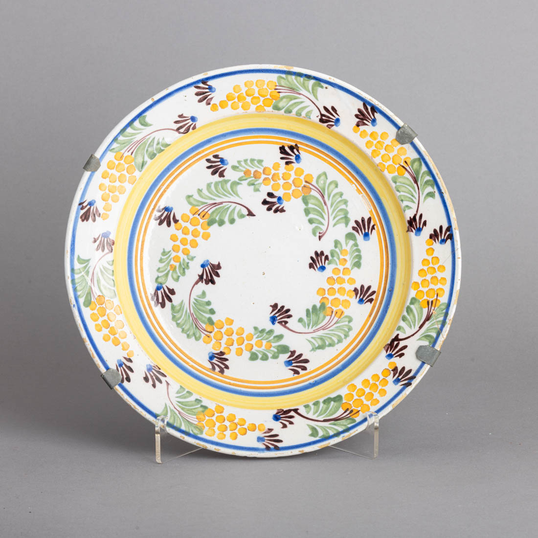 Em faiança portuguesa, decoração policromada "parras e uvas". Séc. XIX. Sinais de uso, desgaste no vidrado e bordo partido e gateado (aprox. 7,5 cm.)