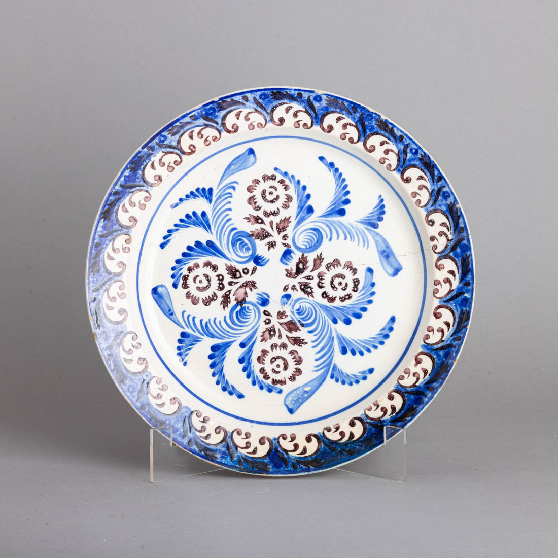 Em faiança portuguesa, decoração a azul e vinoso "motivos vegetalistas e flores". Séc. XIX/XX. Craquelé, esbeiçadelas, restauros e cabelo.