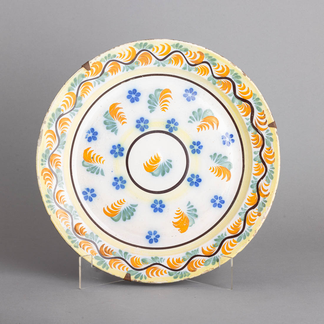 Em faiança portuguesa, decoração policromada "elementos vegetalistas". Séc. XIX. Craquelé, esbeiçadelas e leve desgaste no vidrado.