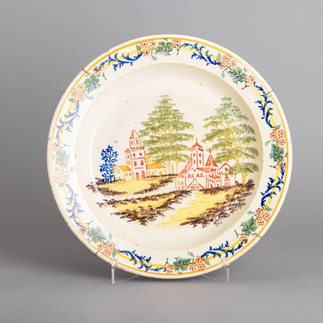Em faiança portuguesa, decoração policromada "paisagem com casario", na aba "flores e ramos". Séc. XIX. Sinais de uso, cabelos gateados e leve desgaste no vidrado.
