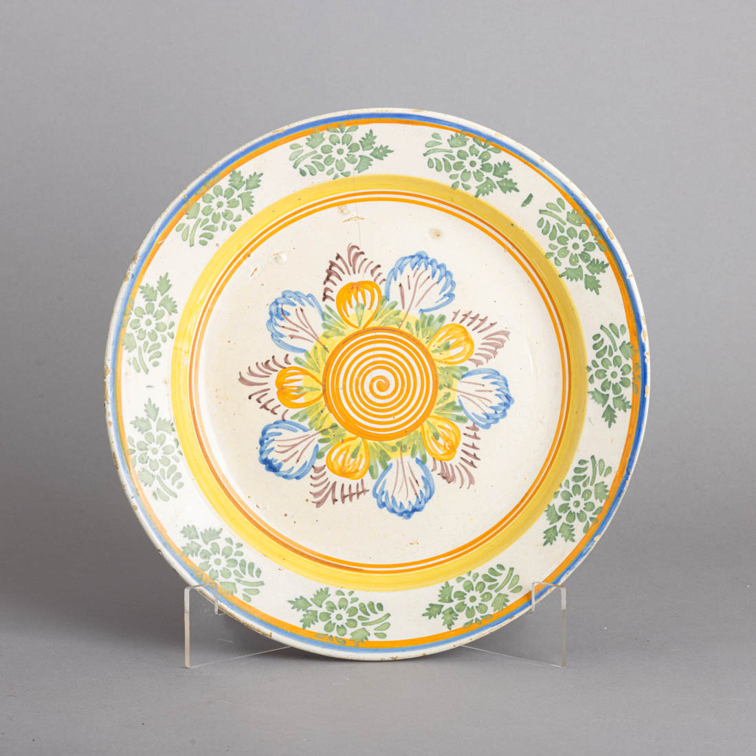 Em faiança portuguesa, decoração policromada "flores". Séc. XIX. Sinais de uso, leve desgaste no vidrado, craquelé e cabelos.