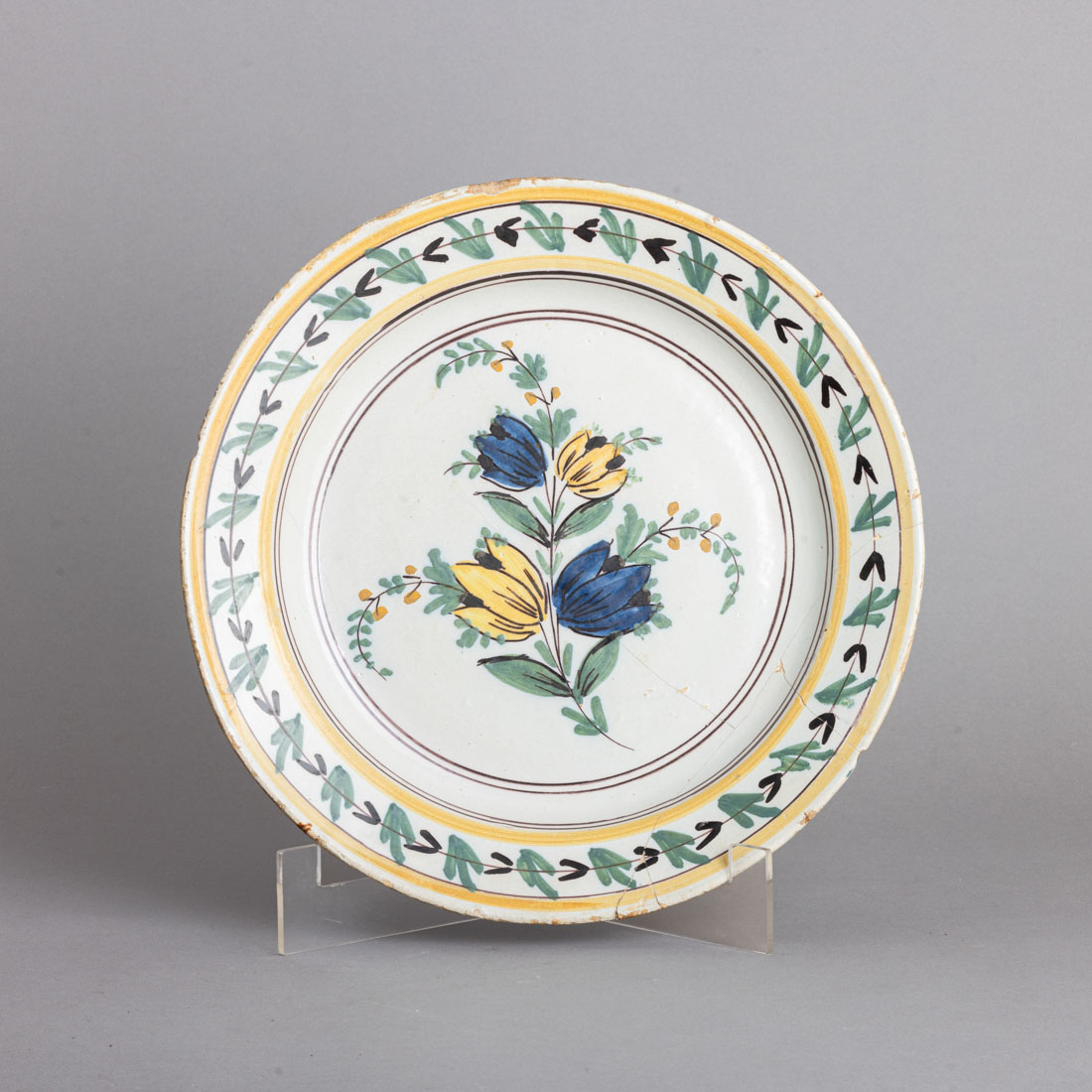 Em faiança, decoração policromada "flores", na aba "motivos vegetalistas". Séc. XIX. Leve desgaste no vidrado, esbeiçadelas e cabelos gateados.