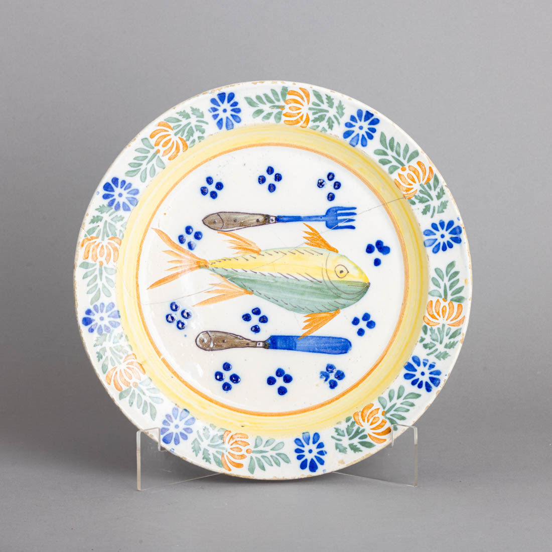Em faiança portuguesa, decoração policromada "peixe e talheres", na aba "flores". Séc. XIX. Leve desgaste no vidrado, pequenas esbeiçadelas e cabelos gateados.