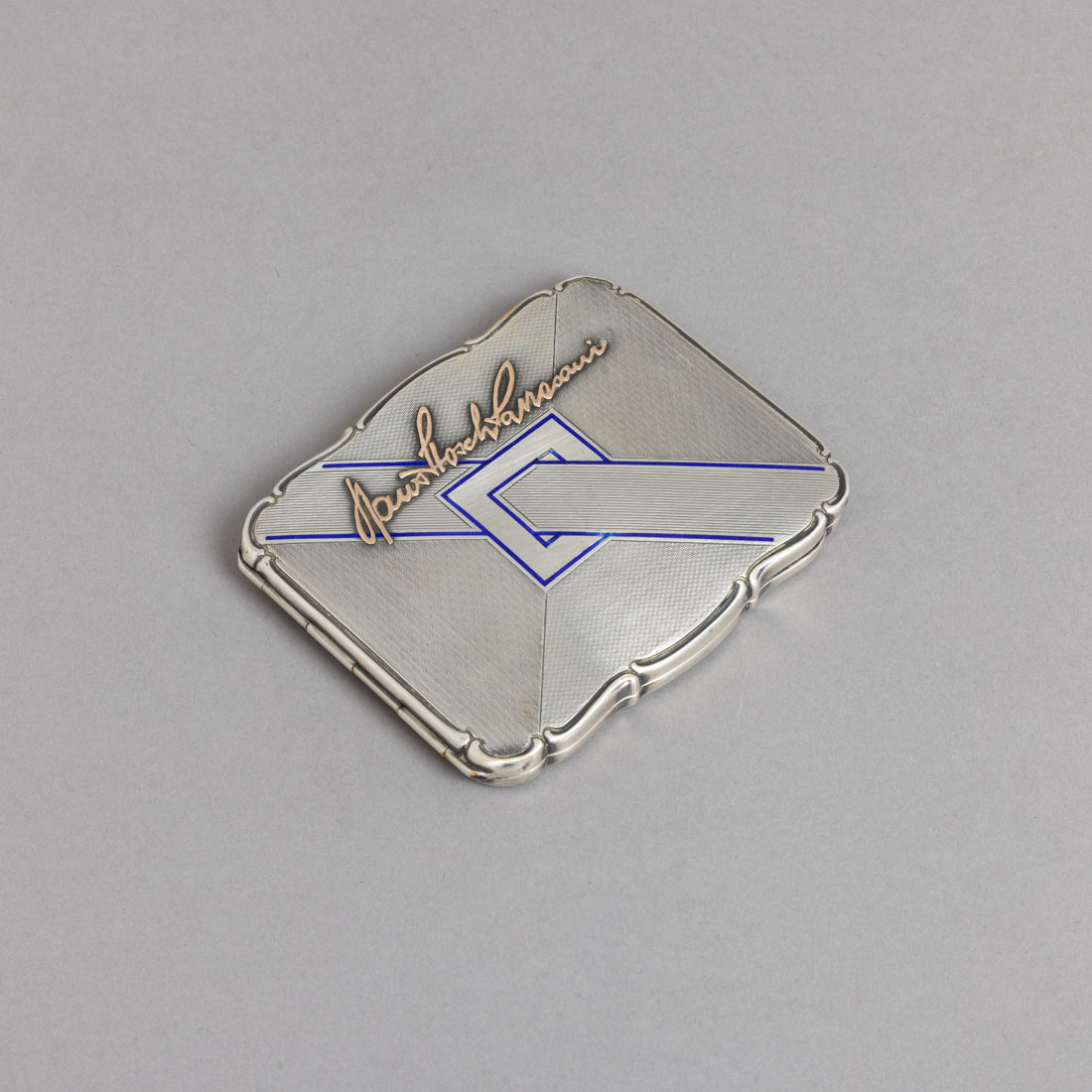 Em prata de 855, decoração gravada, aplicação de esmaltes a azul e nome em ouro baixo. Sem marcas, ao abrigo do Decreto-Lei n.º 120/2017. Sinais de uso e pequenas amolgadelas.