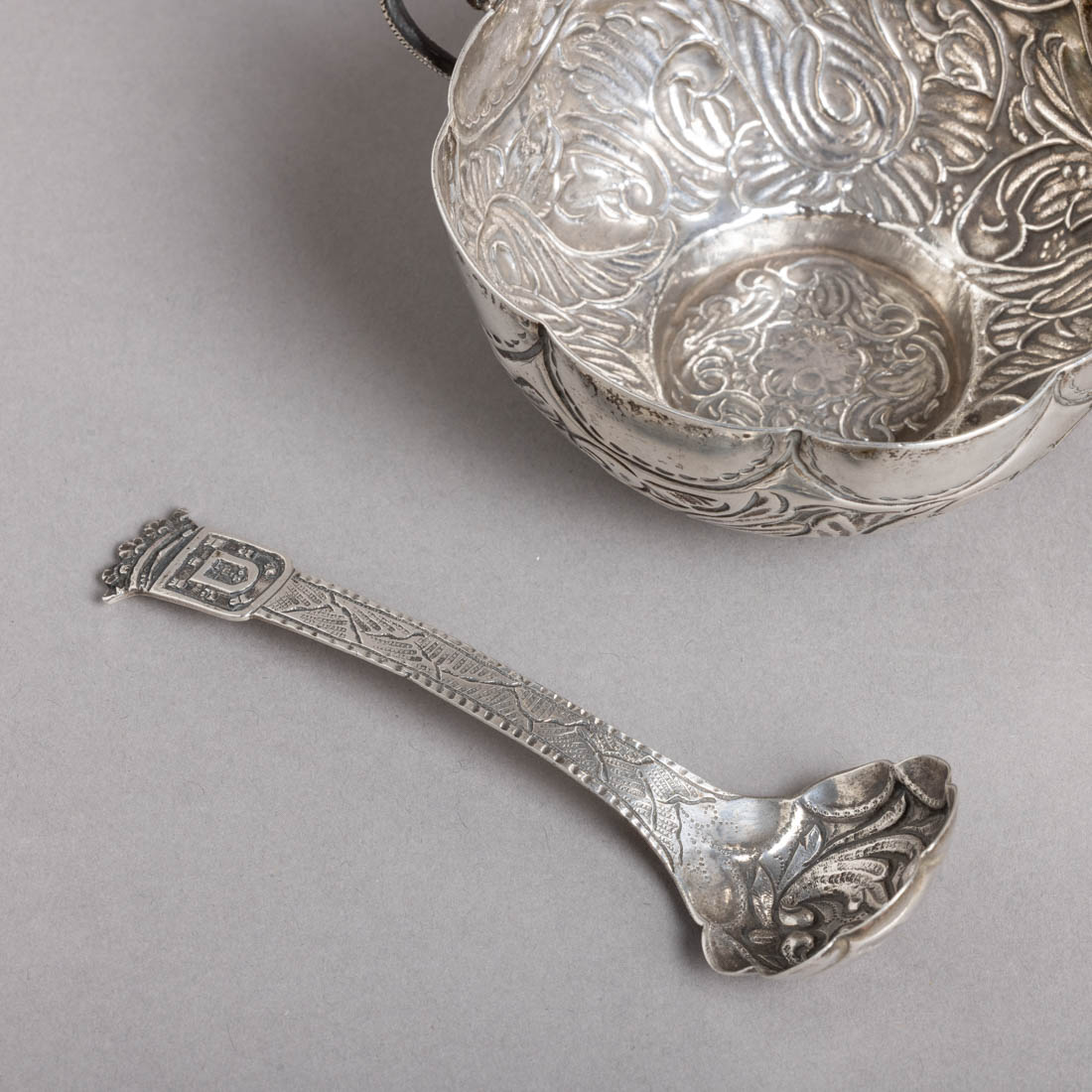 Em prata portuguesa contraste javali (1887-1937) de 833, decoração relevada e gravada "flores, folhas de acanto e armas portuguesas". Sinais de uso e algumas amolgadelas.