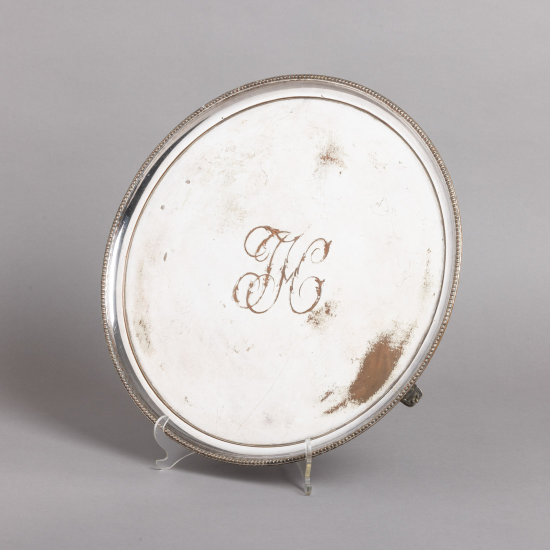 Em metal prateado, decoração lisa, bordo com friso de perlados, monogramada. Sinais de uso e desgaste.