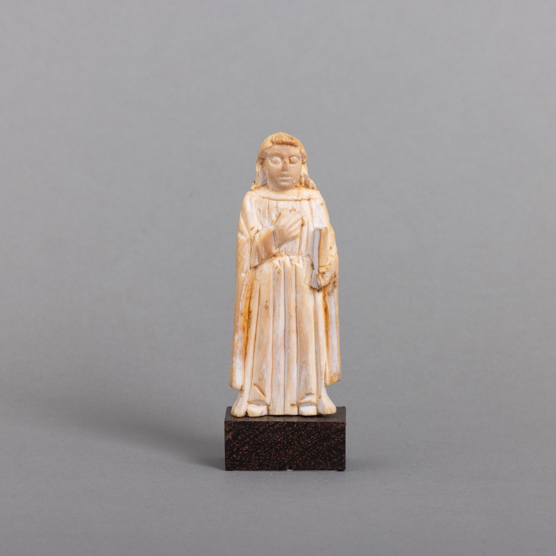 Escultura em osso, base em pau santo. Falha e pequenas fissuras.