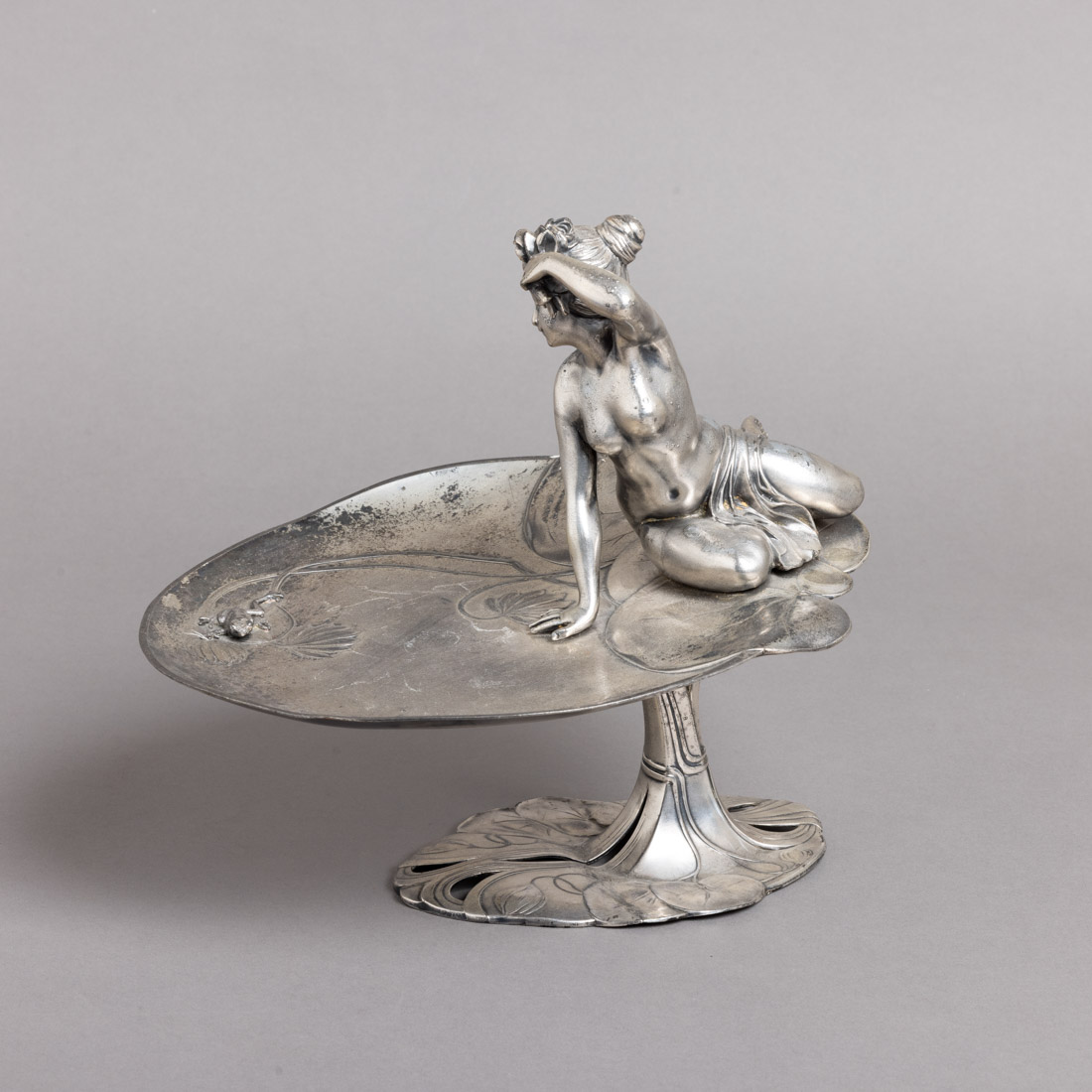 Em liga de metal prateado, decoração relevada "figura feminina, nenúfares e rã". Algum desgaste, figura ligeiramente solta e amolgadelas.