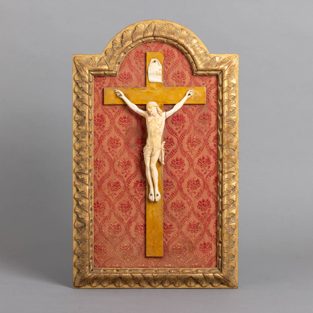 Escultura em marfim, cruz em madeira aplicado sobre tecido bordeaux, moldura em madeira entalhada e ourada. Pequenos defeitos.