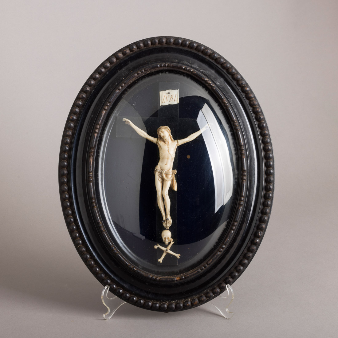Cristo e memento mori esculpidos em osso, cruz em madeira, assente sobre painel de veludo, moldura oval em madeira ebanizada com frisos de perlados. Pequenas falhas.