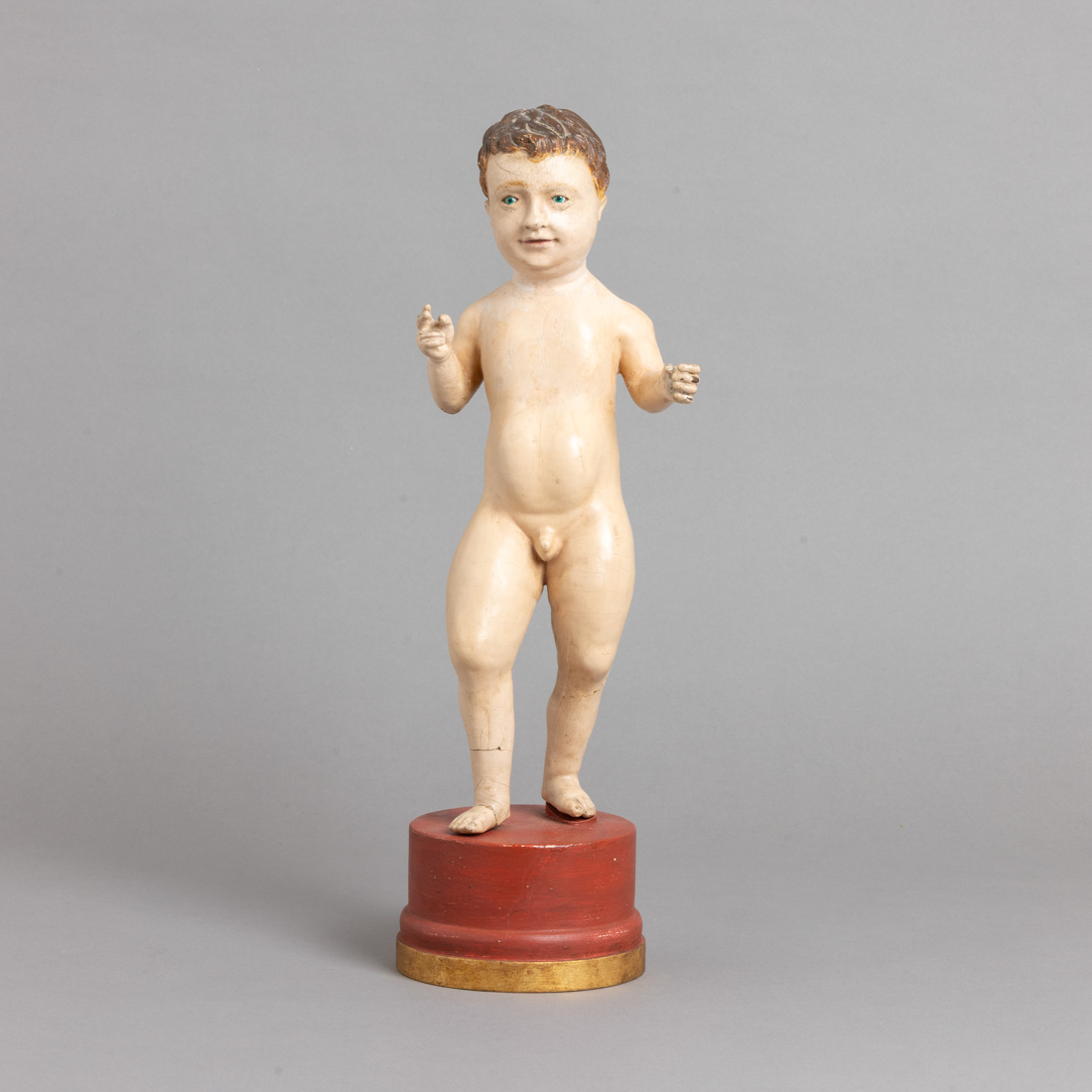 Escultura em madeira policromada, olhos em vidro. Séc. XVIII/XIX, base em madeira pintada e dourada. Pequenas falhas, restauros, perna e pé colados.