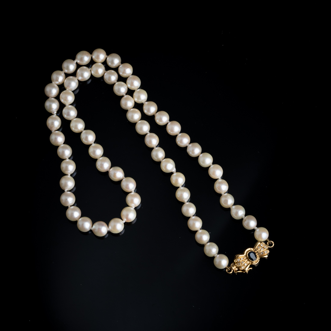 Com fiada de pérolas de cultura (não testadas), fecho em ouro português de 19,2Kt., contraste veado (pós 1985), cravejado com safira em talhe oval e diamantes em talhe de brilhante. Sinais de uso.