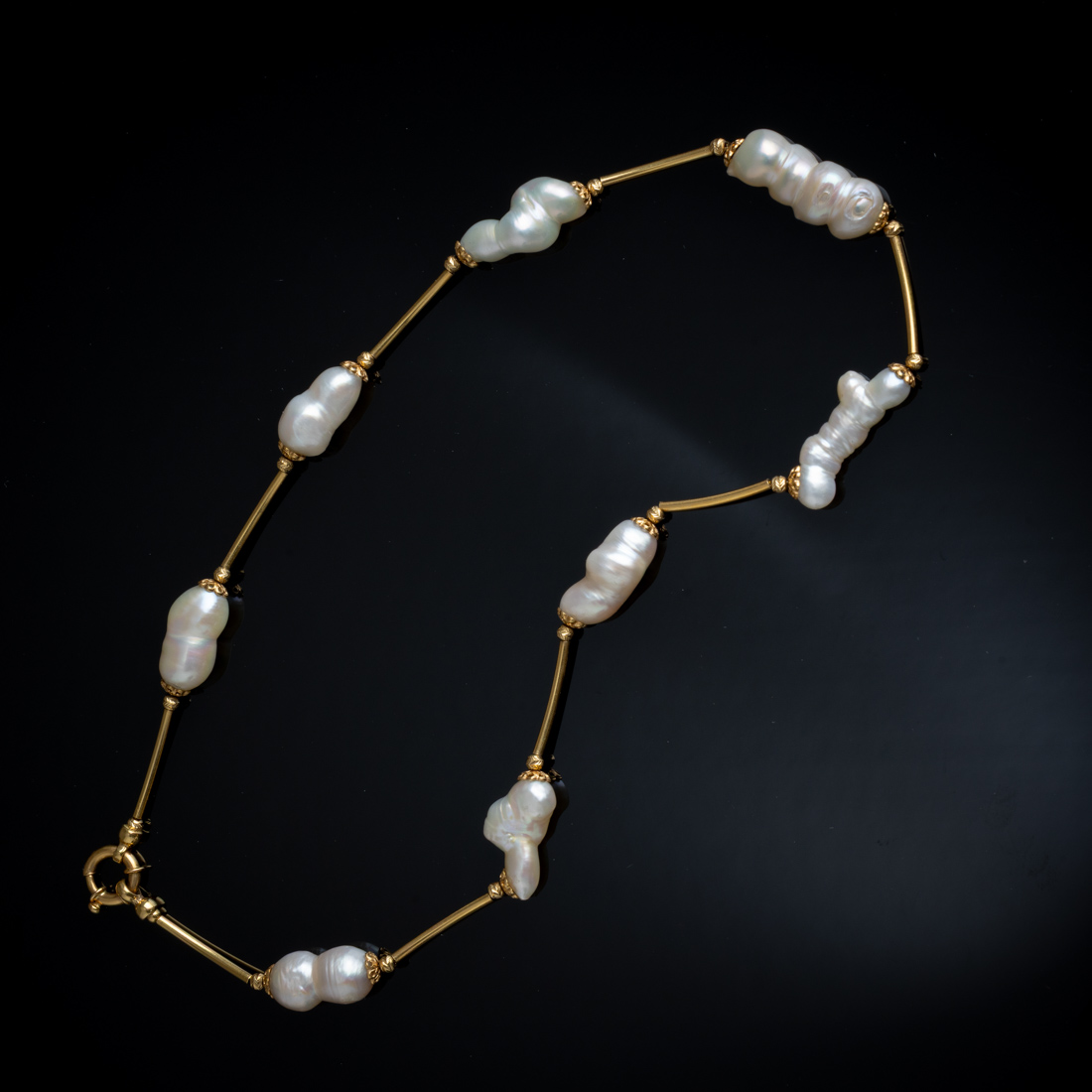 Em ouro português de 19,2Kt., contraste veado (pós 1985) e pérolas barrocas de água doce. Sinais de uso.