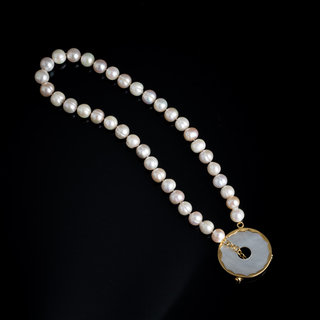 Com fiada de pérolas de cultura de água doce (não testadas), fecho e aro em ouro português de 19,2Kt., contraste veado (pós 1985), placa de madrepérola. Sinais de uso.