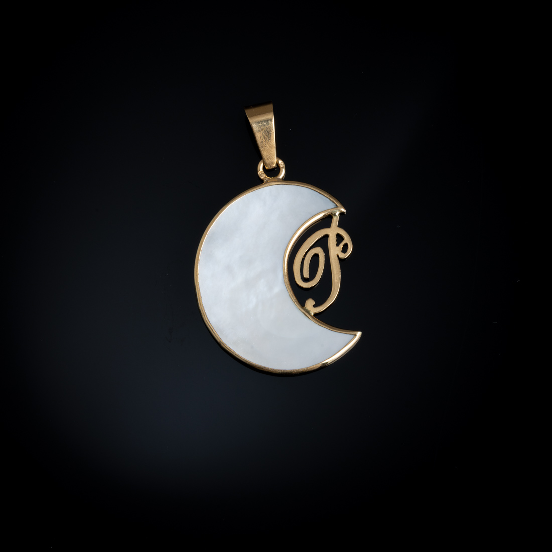 Em ouro português de 19,2Kt., contraste veado (pós 1985) e placa na forma de lua em madrepérola com letra "P". Sinais de uso.