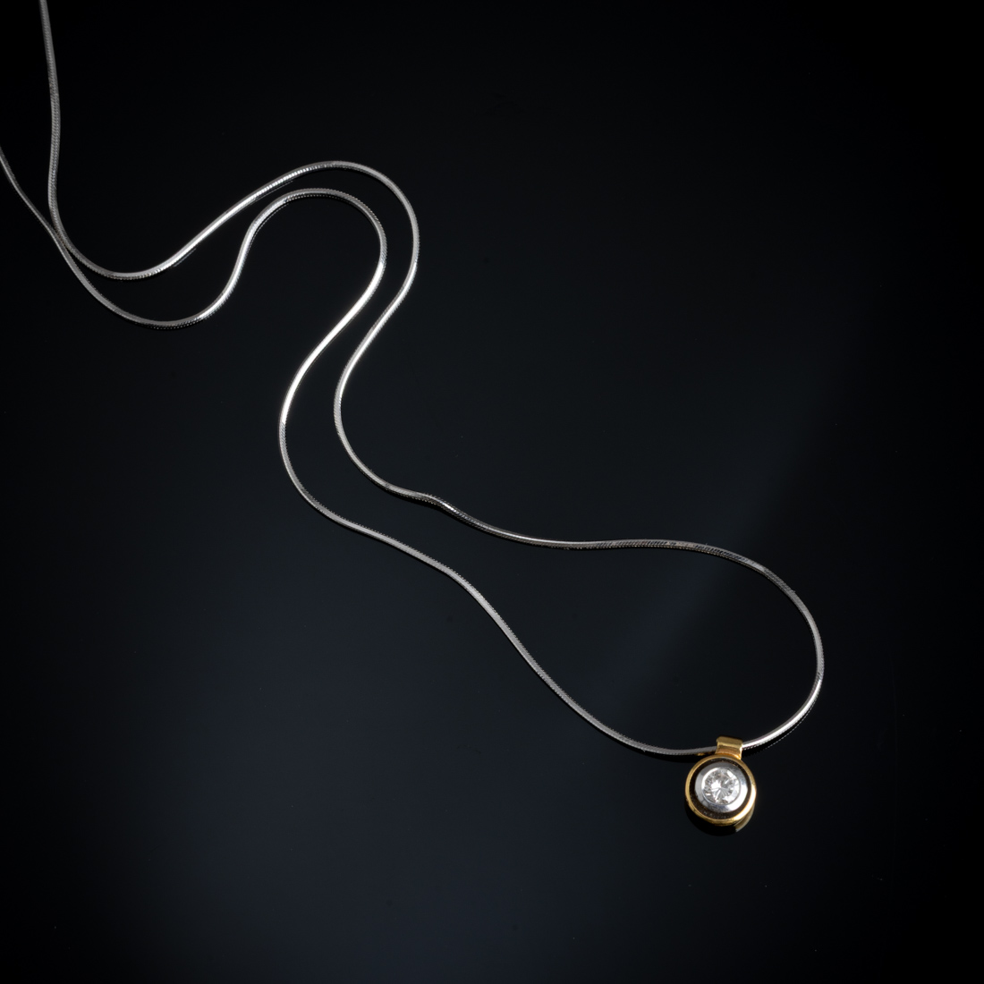 Em ouro bicolor de 18Kt., pendente cravejado com diamante em talhe de brilhante Sem marcas, ao abrigo do Decreto-Lei n.º 120/2017. Sinais de uso.