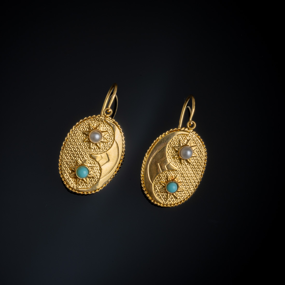 Em ouro de 19.2Kt., contraste veado (pós 1985), cravejado com meias pérolas e contas tom turquesa. Sinais de uso.