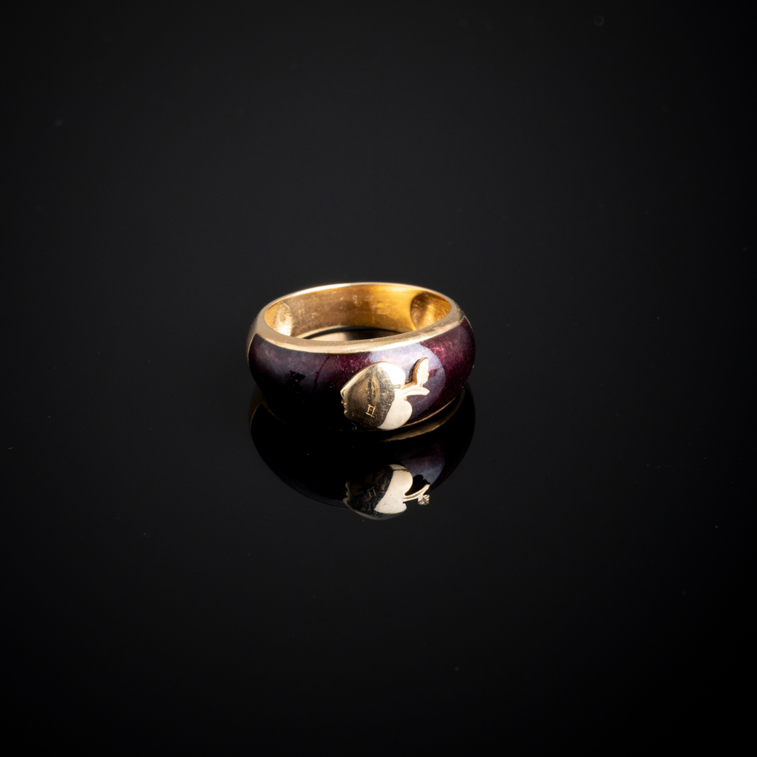 Em ouro português de 19.2Kt., contraste veado (1938-1984), aplicação de esmalte e decoração relevada "maçã". Sinais de uso.