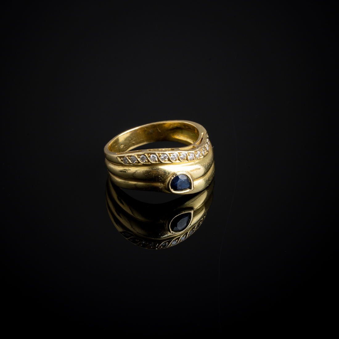 Em ouro português de 19.2Kt., contraste veado e galo (pós 1985) cravejado com diamantes em talhe de brilhante e safira em talhe gota. Sinais de uso.