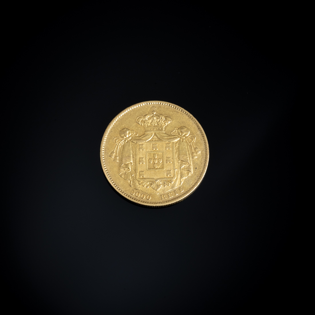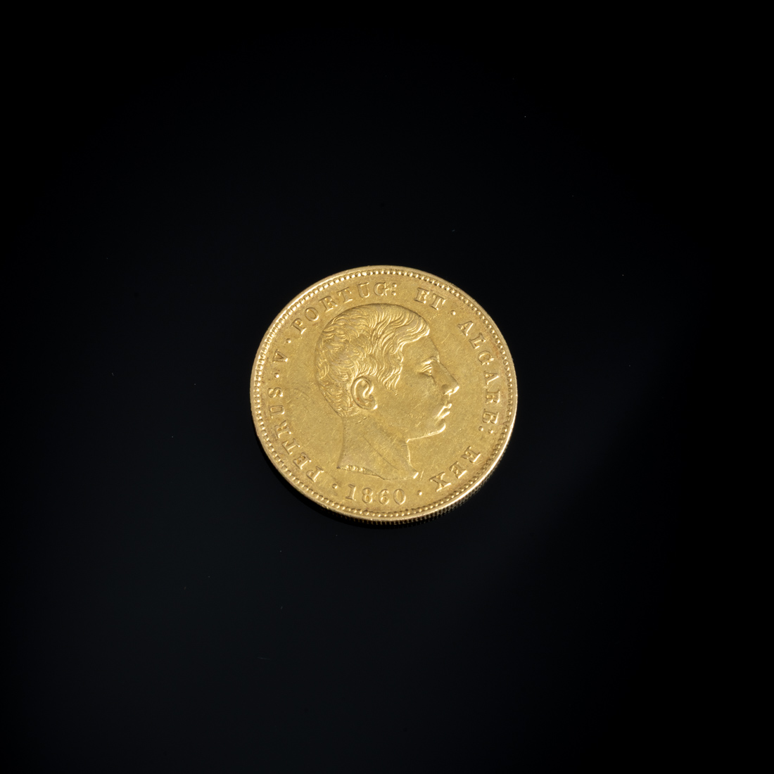 Em ouro português de 22Kt., de 5000 reis, 1860. Sinais de uso.