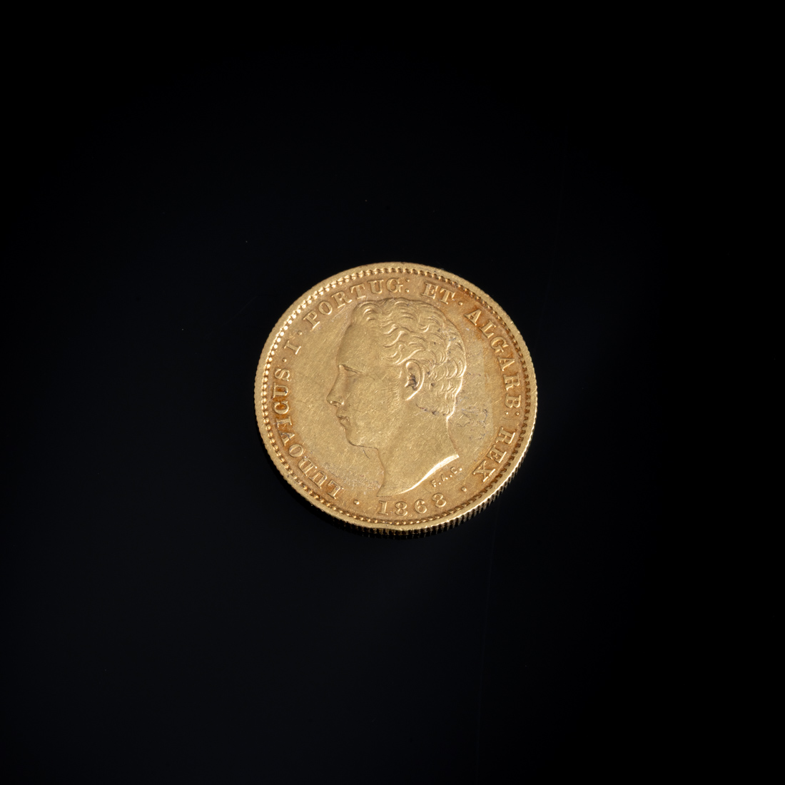 Em ouro português de 22Kt., de 5000 reis, 1868. Sinais de uso.