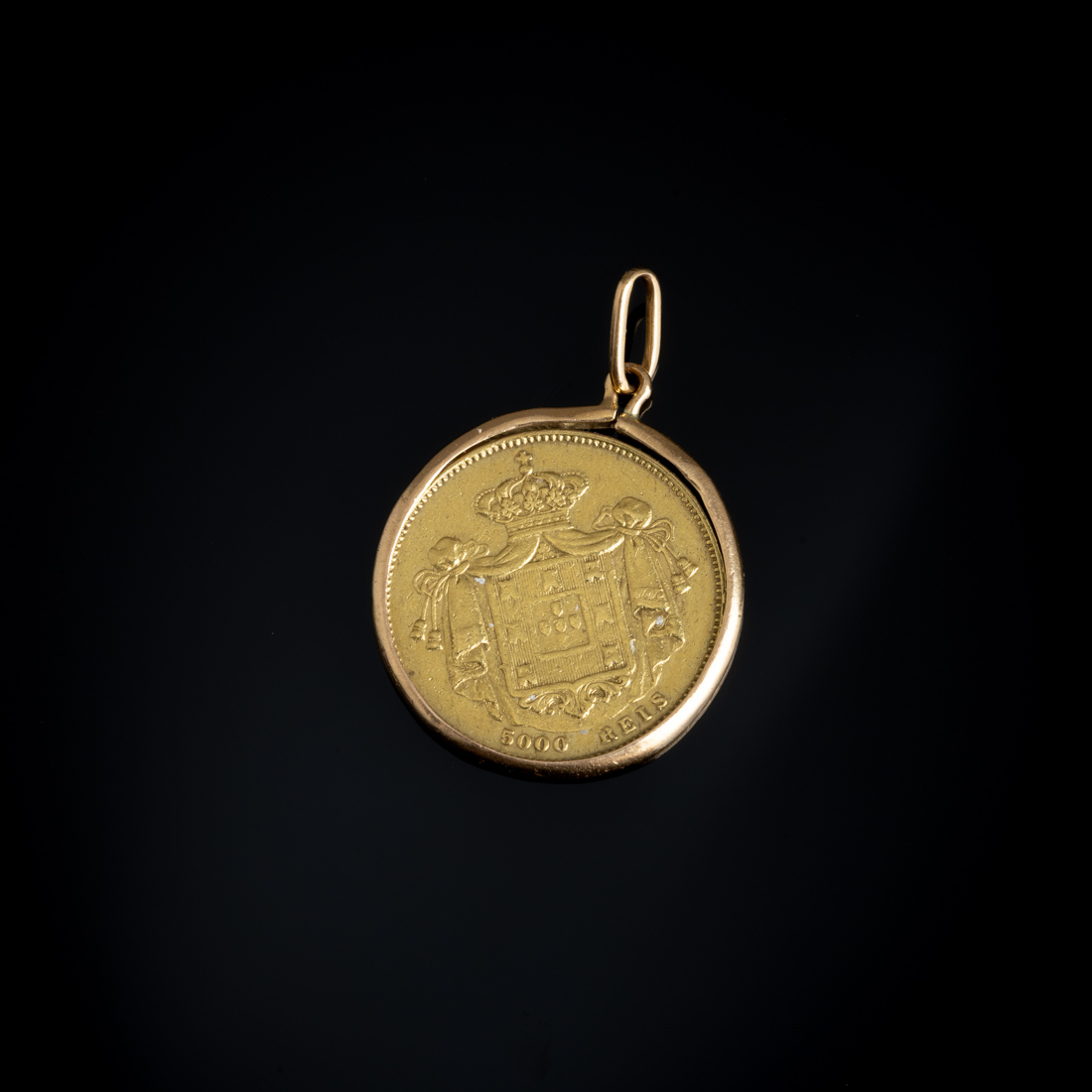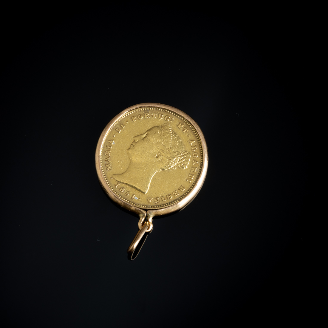 5000 Reis em ouro de 22Kt., 1851, aro em ouro português de 19,2Kt., sem marcas, ao abrigo do Decreto-Lei n.º 120/2017. Não fixa. Sinais de uso.