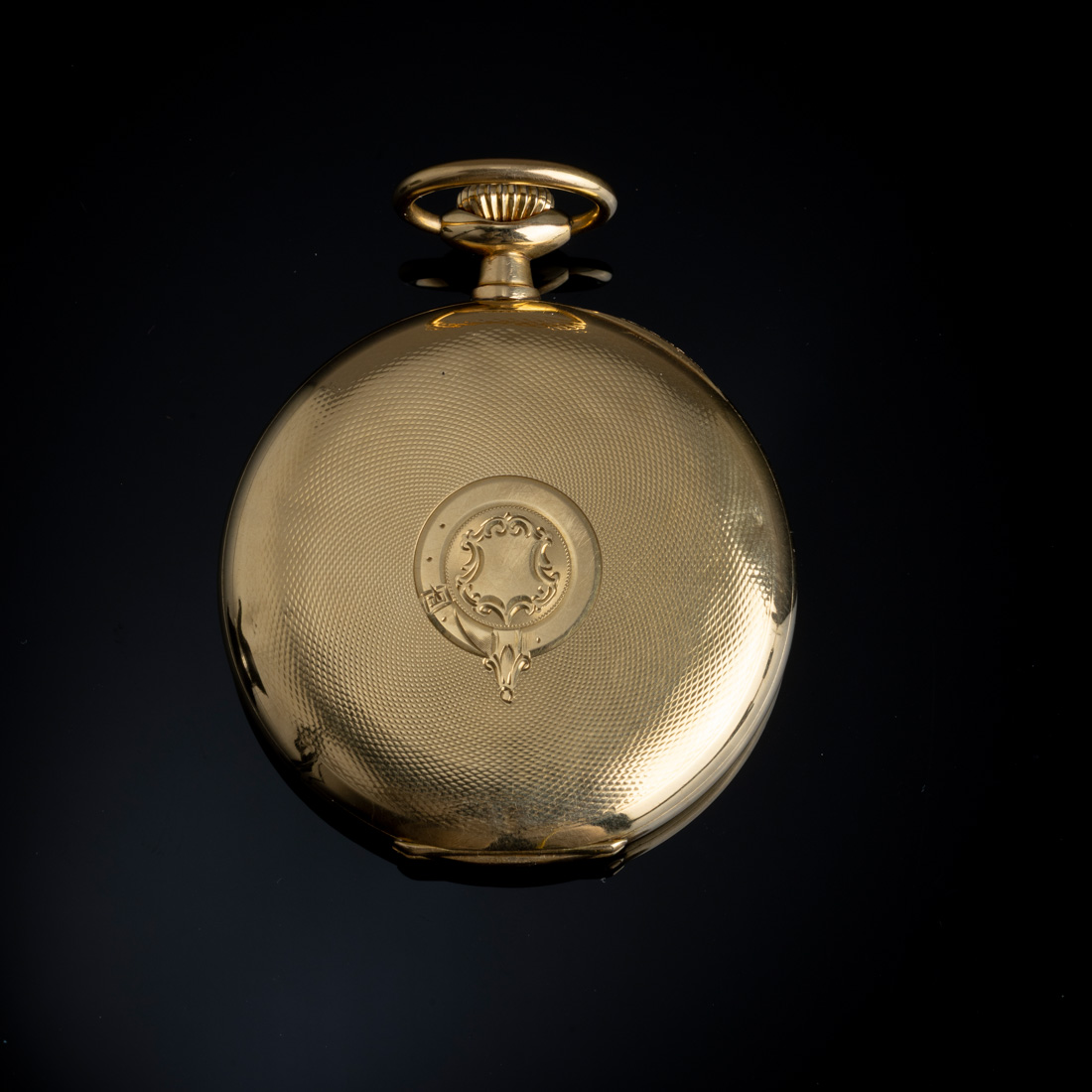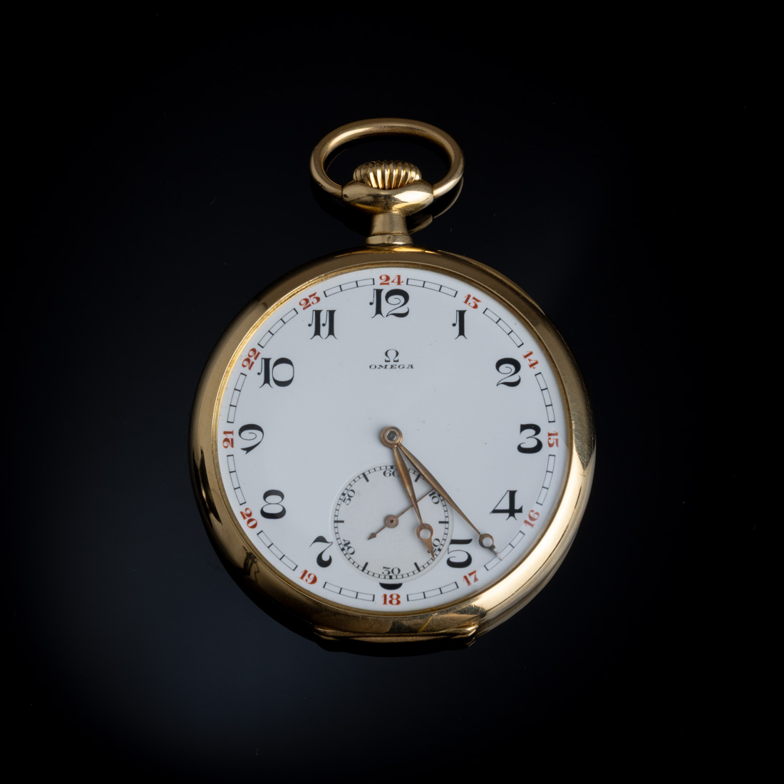 Suíço. Caixa em ouro 18Kt., mostrador em esmalte branco com numeração árabe. Movimento mecânico de corda. Em marcha. Sinais de uso e pequenas amolgadelas.