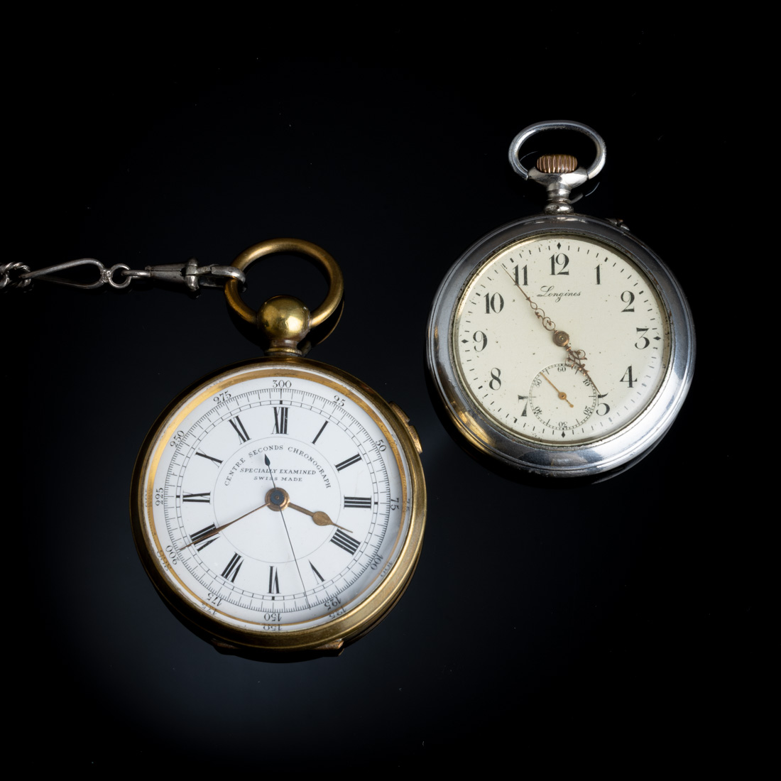 Caixas em metal amarelo e prateado, um com corrente em prata portuguesa contraste águia (1938-1984) de 833. Mostradores em esmalte branco com numeração árabe e romana. Movimento mecânico de chave. Com chave. Sinais de uso, pequenos defeitos e alguma oxidação. Dim.: 5,2 e 5,5 cm.
