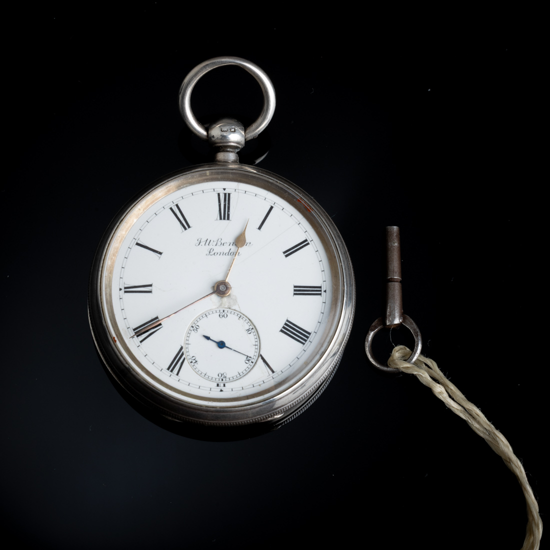 Inglês. Caixa em prata 925, marcas de garantia da cidade Londres (1894), marca de ourives "J.W.D", decoração gravada. Mostrador em esmalte branco com numeração romana. Movimento mecânico de chave. Com chave. Em marcha. Sinais de uso, leves cabelos e falhano mostrador. Peso total aprox.: 124 g. Dim.: 5 cm. Sem marcas portuguesas, ao abrigo do Decreto-Lei n.º 120/2017.