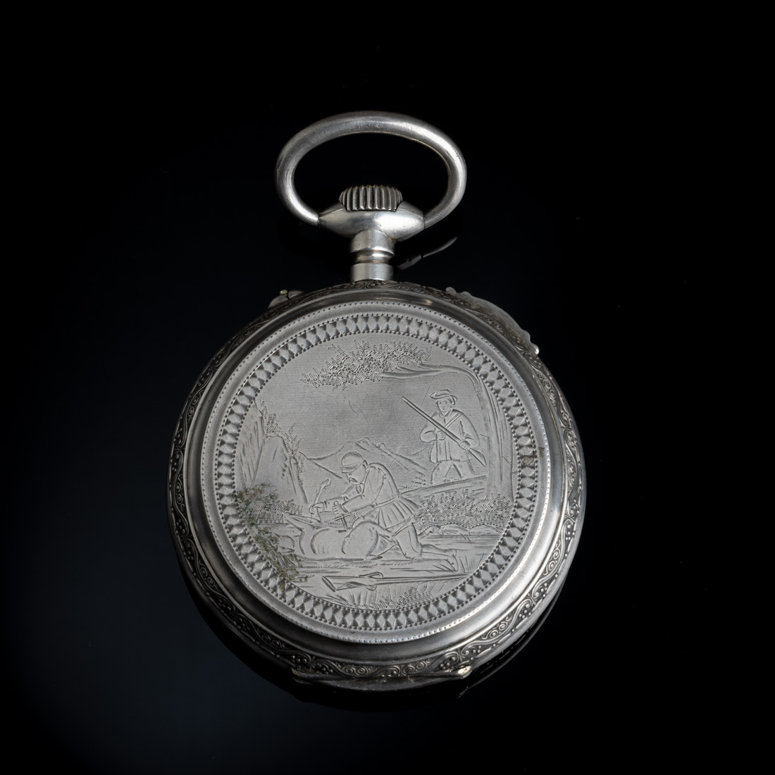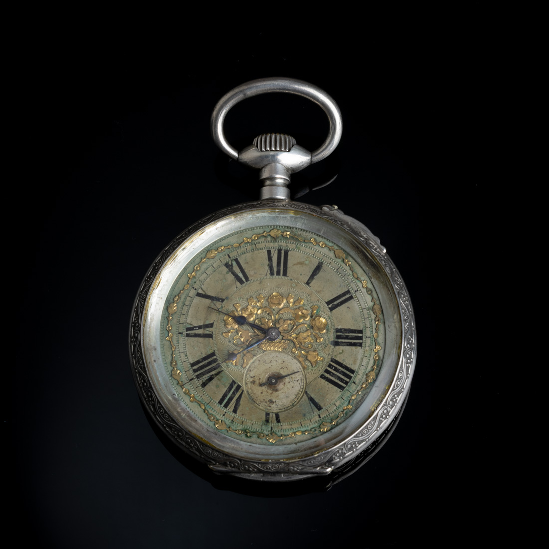 Caixa em prata de 800, decoração gravada e relevada, marcas de garantia de teor. Mostrador com numeração romana. Movimento mecânico de corda. Em marcha. Sinais de uso e pequenos defeitos. Peso total aprox.: 295 g. Dim.: 8 cm. Sem marcas portuguesas ao abrigo do Decreto-Lei n.º 120/2017.