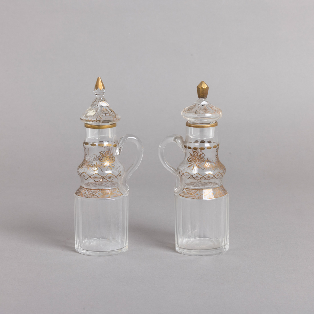 Em vidro facetado decoração a dourado "grinaldas e frisos geométricos". Sinais de uso, ínfimas esbeiçadelas e um pomo com aplicação em metal.