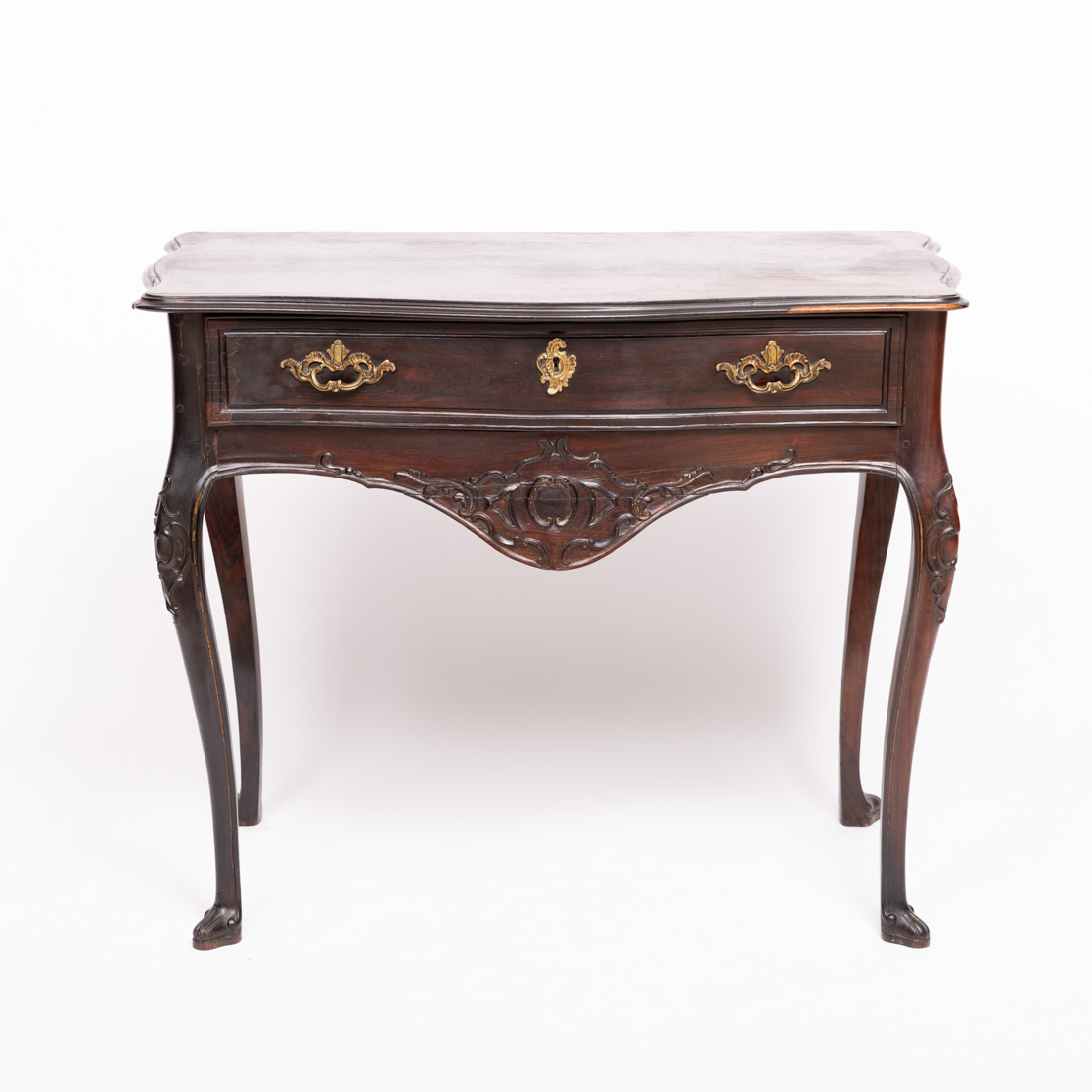 Estilo D. José, em pau santo com entalhamentos, saias e tampo recortado com realces dourados, com gaveta, ferragens em metal dourado. Séc. XIX. Pequenas falhas, restauros e defeitos.