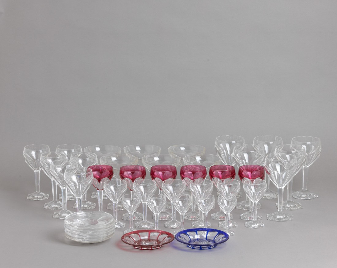 Em cristal e cristal bicolor Val Saint Lambert (copos de água marcados), decoração facetada. Composto por copos de água, de vinho tinto, de vinho branco, de Porto, taças de champanhe 5 copos de licor e 7 pires. Sinais de uso, duas taças e pires com esbeiçadelas.