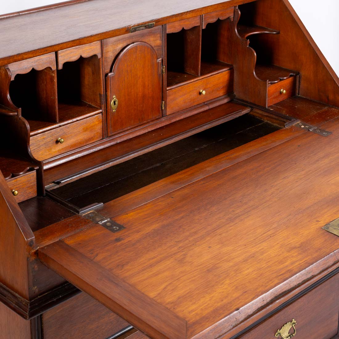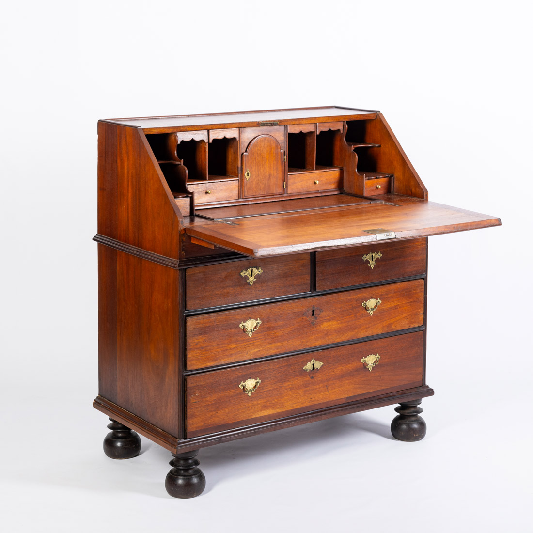 Em carvalho e outras madeiras, de duas gavetas e dois gavetões, no interior gavetas, escaninhos e porta central, com segredo, ferragens em latão gravado. Séc. XIX. Pequenas faltas e defeitos.