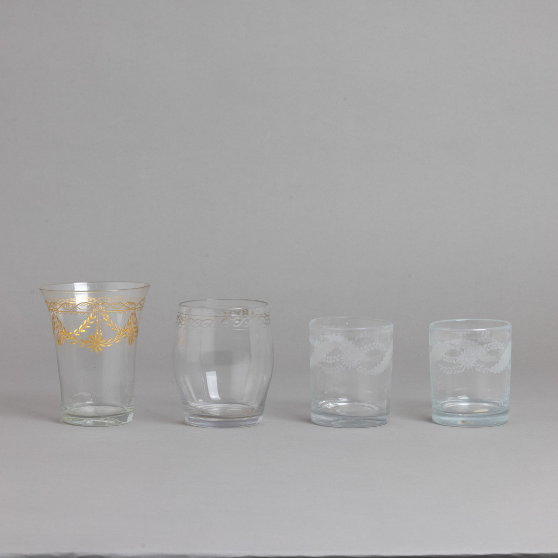 Em vidro e cristal soprado e moldado, decoração gravada a ácido, um a dourado. Sinais de uso e ligeiro desgaste.