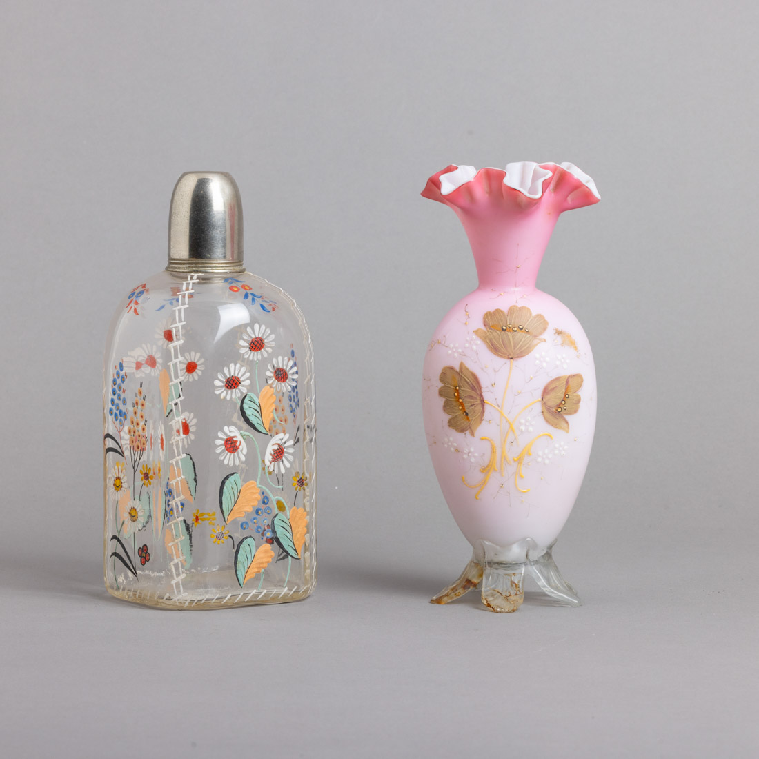 Em vidro pintado, decoração policromada "flores", frasco com rolha e copo em metal de rosca. Sinais de uso, copo com pequenas amolgadelas e jarra com falhas nos pés.