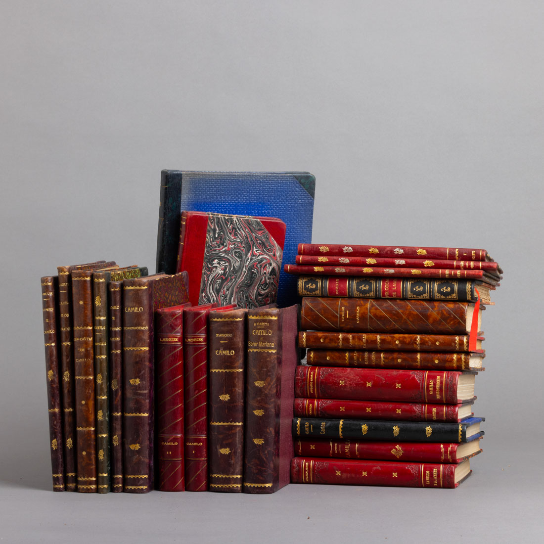 Composto por vinte e quatro obras, de várias editoras. Encadernações em pele. Sinais de uso e manchas de humidade.