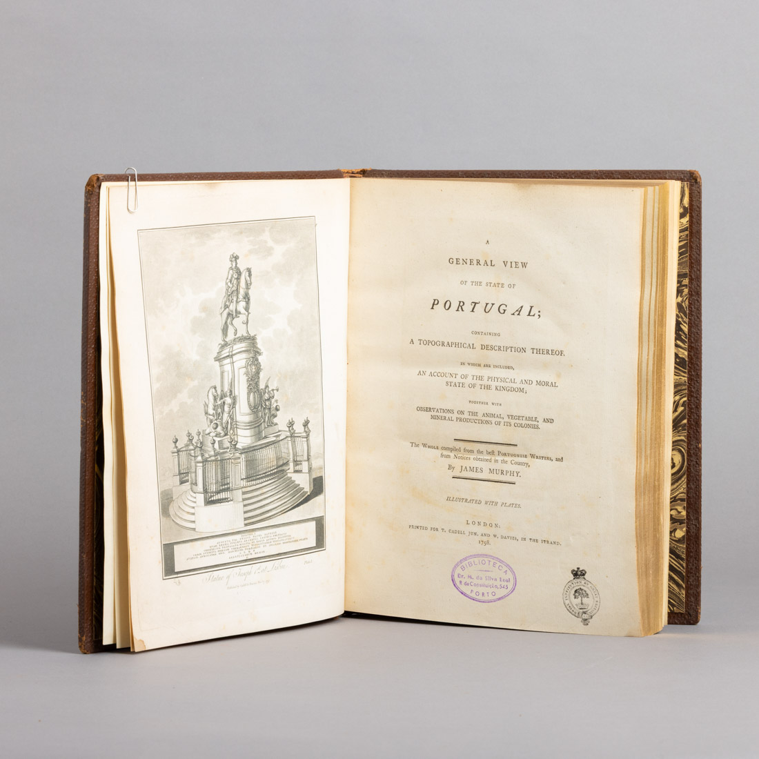 Por James Murphy. Edição por T. Cadell Lun. e W. Davies, Londres, 1798. Com gravura da estátua equestre de D. José I, 13 gravuras extra-texto coloridas à mão e um mapa de Portugal em folha desdobrável. Marcas de humidade e desgaste na lombada.