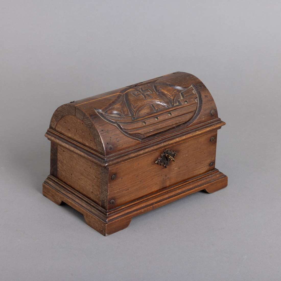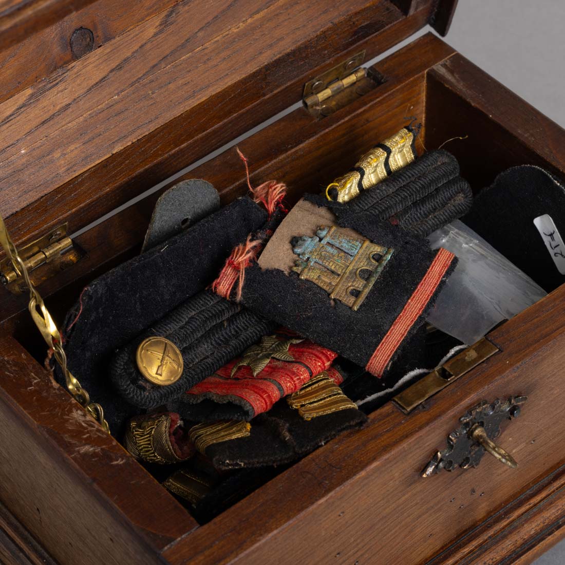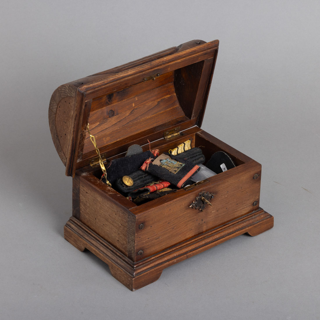 Em madeira, na tampa caravela entalhada, no interior diversas insígnias, divisas, dragonas e emblemas, entre outras curiosidades. Sinais de uso, pequenas falhas e defeitos, baú com vestígio de xilófagos.