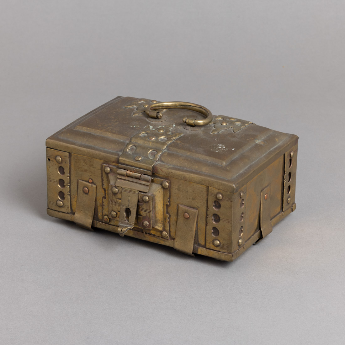 Em folha de metal amarelo, marcada no interior da tampa P. H. Muntz´s. Séc. XIX/XX. Falta chave, falhas e pequenos defeitos.