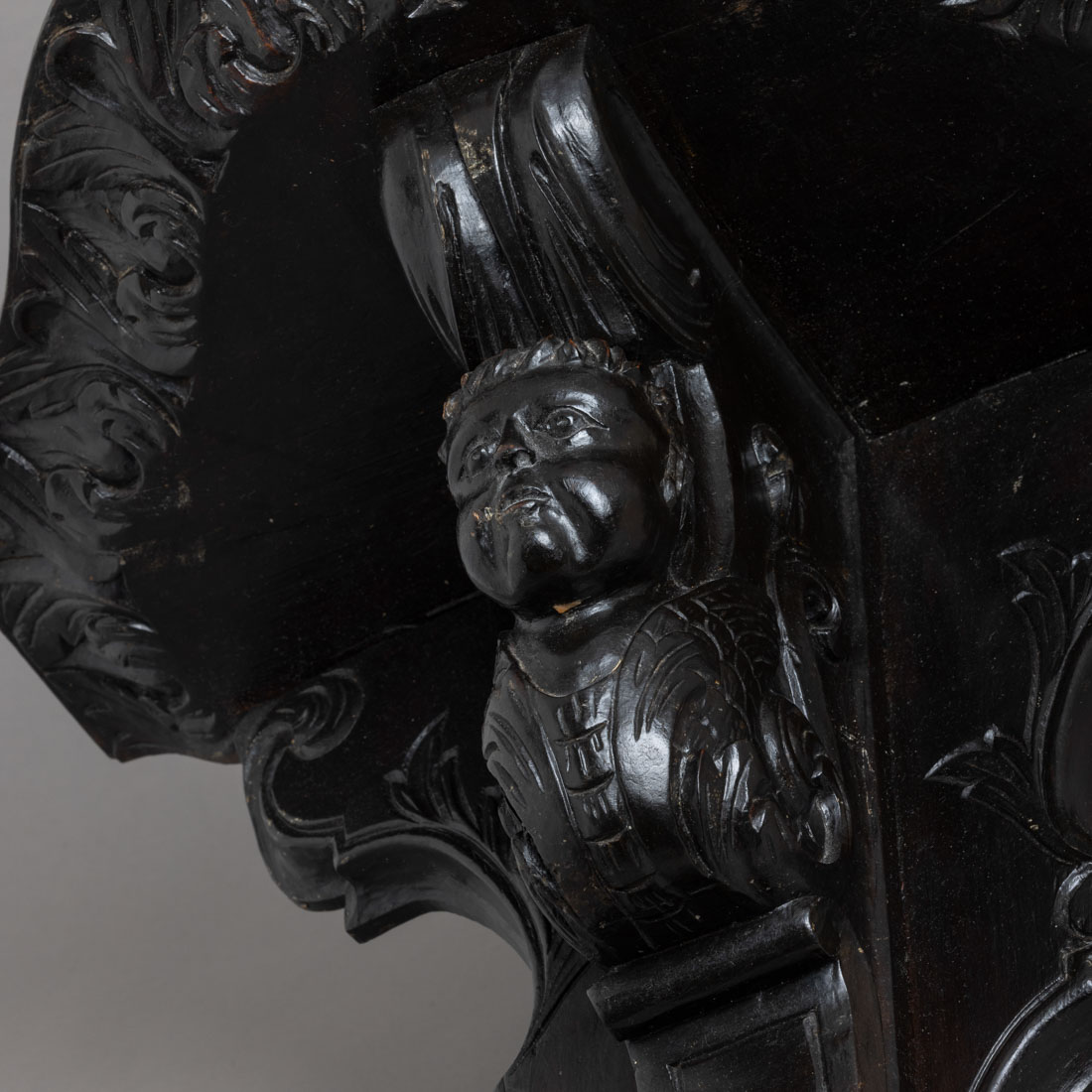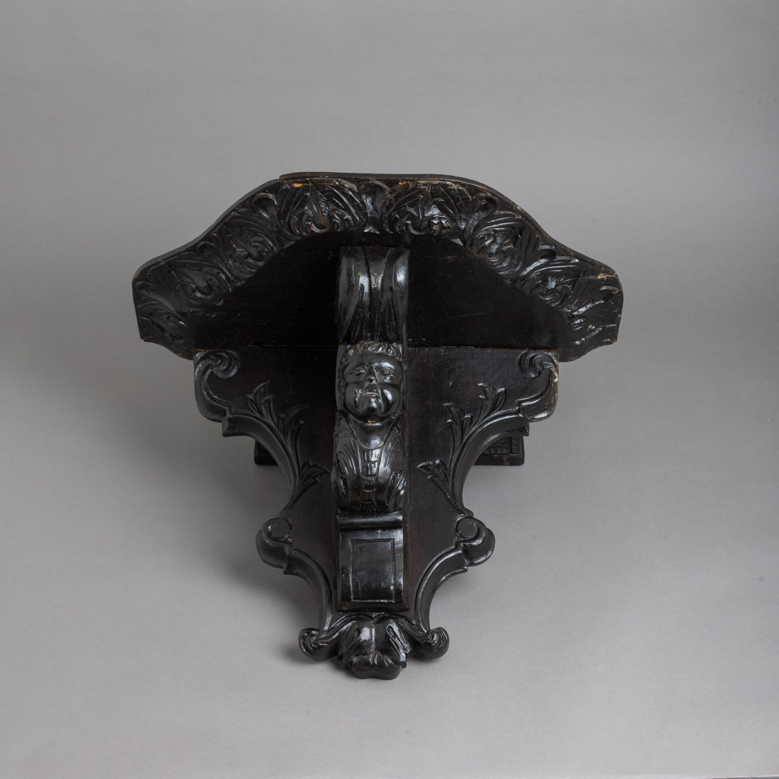 Em madeira escurecida com entalhamentos, decoração "cabeça de querubim". Sinais de uso e algumas falhas.