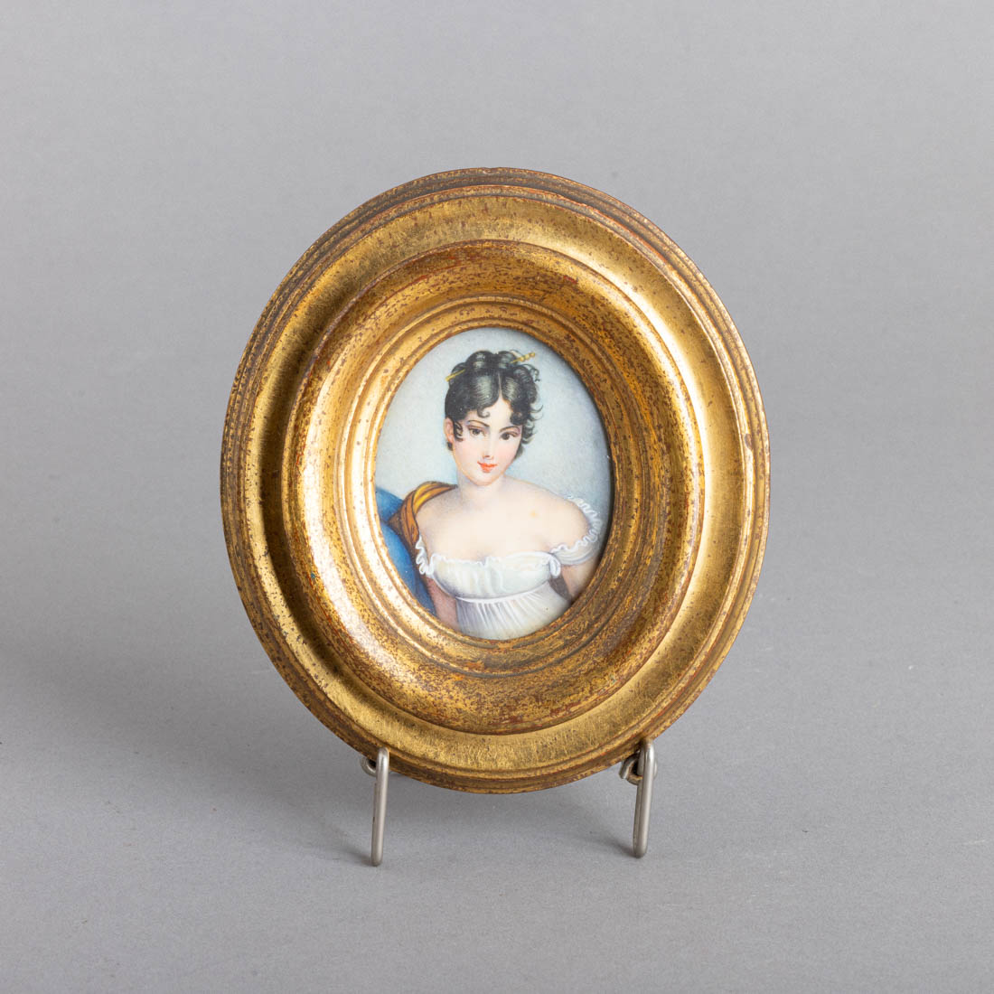 Pintura miniatura sobre placa oval, moldura em madeira dourada. Sinais de uso.