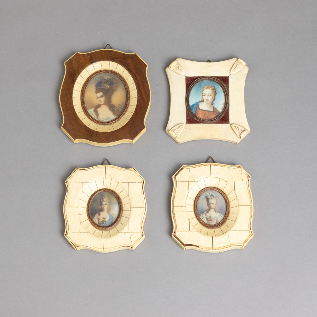 Pinturas miniatura sobre placa oval, assinadas. Molduras em osso e outros materiais, aros em metal dourado. Pequenos defeitos, duas molduras com falhas e defeitos.