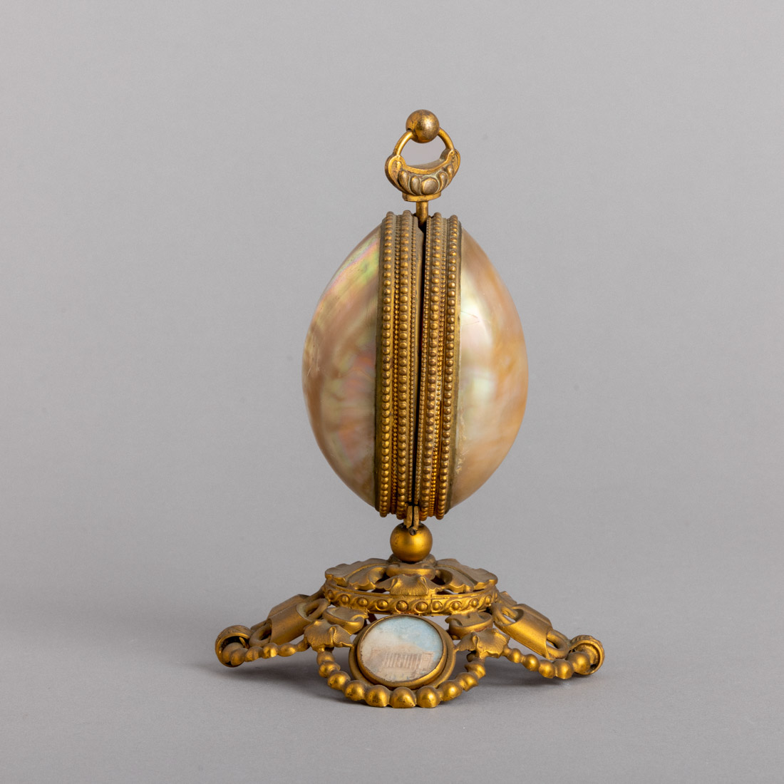 Em metal amarelo, madrepérola e vidro, decoração relevada e vazada "perlados, cartelas e motivos vegetalistas". Francês, Séc. XIX. Amolgadelas, falhas e faltas.