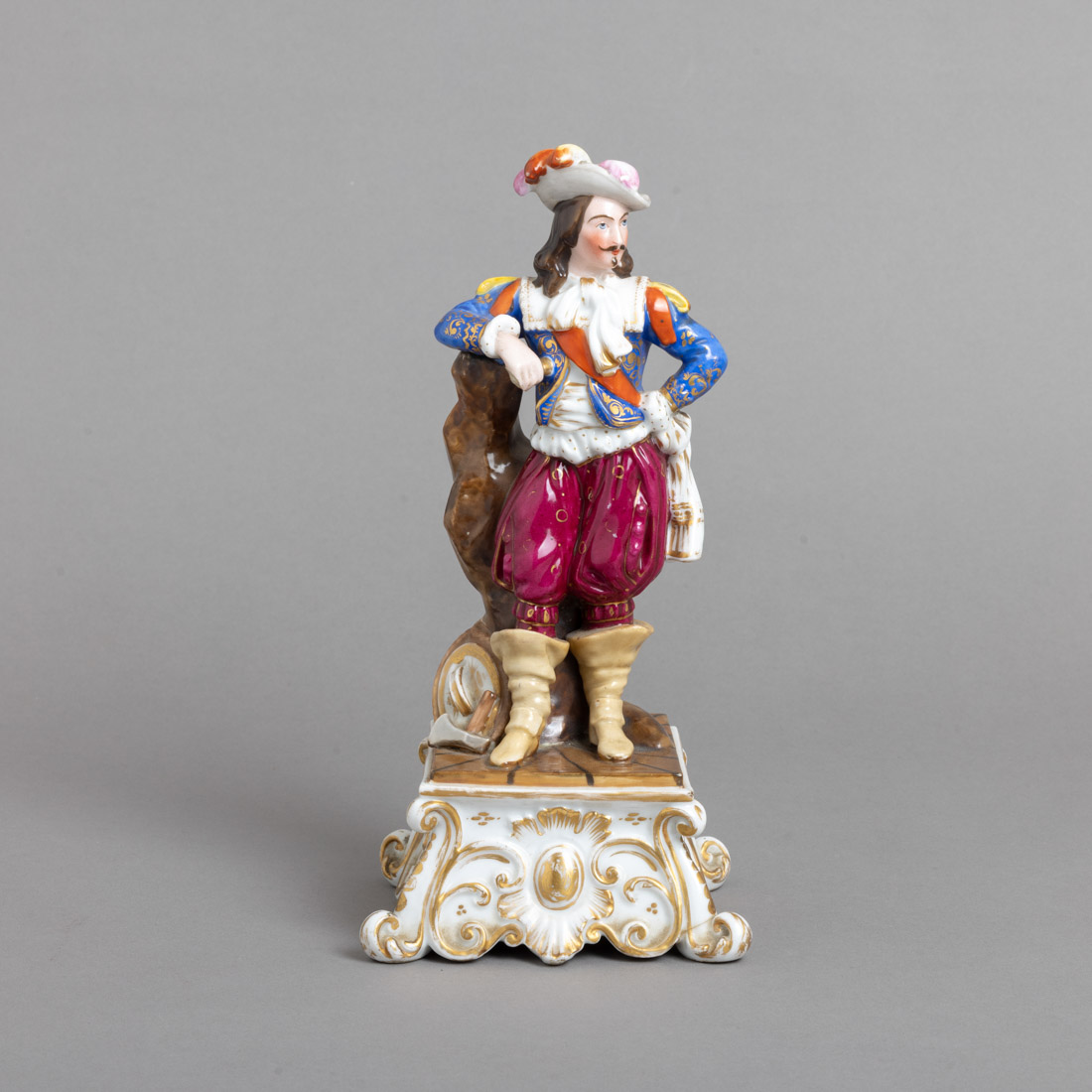 Escultura em porcelana, decoração policromada e dourada. Europa, Séc. XIX/XX. Sinais de uso, esbeiçadela, falhas e ponta da peanha colada.